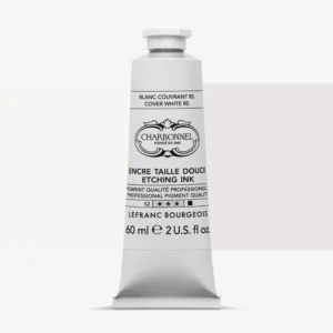 Charbonnel Covering White Etching ink. Cover White RS on sinkkivalkoinen intaglioväri, joka sisältää bariumia. Se tarjoaa keskinkertaisen peittävyyden ja läpinäkyvyyden, ja se sijoittuu ominaisuuksiltaan Snow White Titanium – ja Snow White RS -etsausvärien väliin.