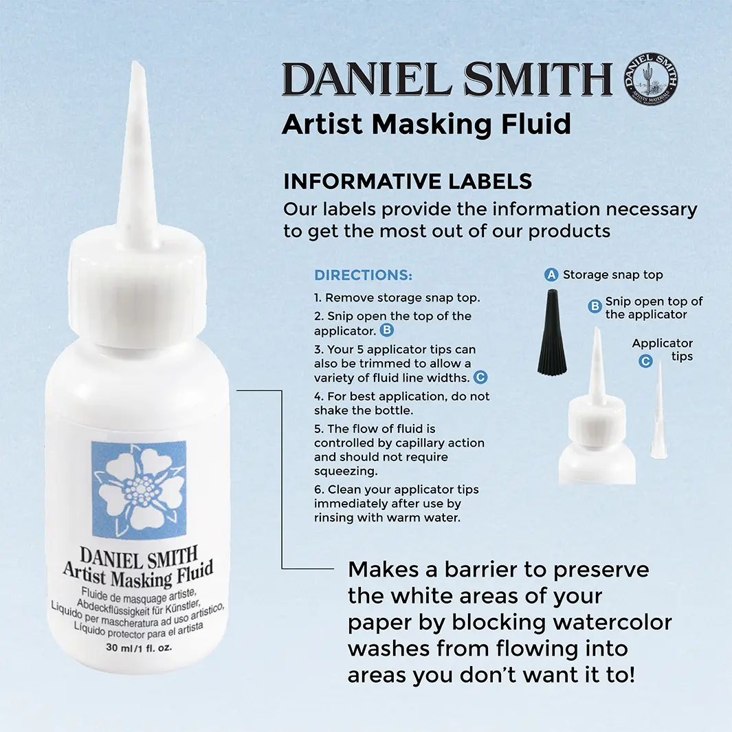 Käytä Daniel Smith Artist Masking Fluid 30ml luodaksesi este, joka suojaa haluttua valkoista tilaa estämällä vesiväripesun. Levityksen jälkeen se kuivuu läpinäkyväksi karamelliväriksi, jotta näet sen työskennellessäsi. Kuivunut neste on helppo hieroa pois sormin tai kumi-sementtipoimulla.
