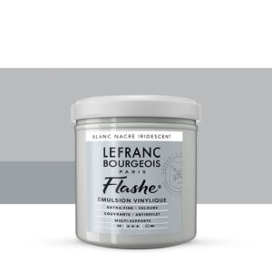 Flashe Pearl white iridescent 125ml. Is an artist’s vinyl color that can be diluted with water and is completely waterproof when dry. Give a matte, velvety smooth and opaque coverage result. Perfect for preparing foundations, outdoors and popular on concrete and stone.