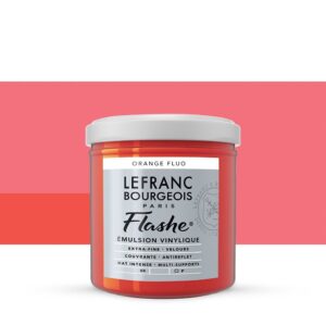 Flashe Fluorescent orange 125 ml. Is an artist’s vinyl color that can be diluted with water and is completely waterproof when dry. Give a matte, velvety smooth and opaque coverage result. Perfect for preparing foundations, outdoors and popular on concrete and stone.