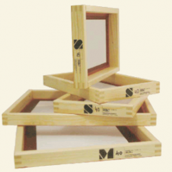 Laadukas mäntyrunko sinkkikulmilla. Valkoinen polyesteriseula, venytetty 16 N painatuksella. Numero osoittaa seulan tiheyden langan määränä / cm.