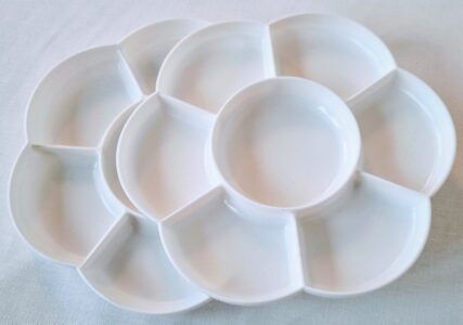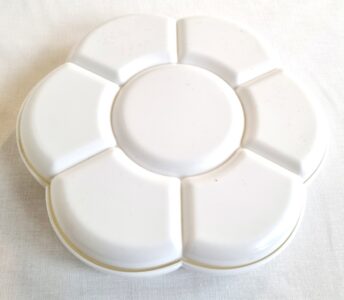 Paletti kukka Muovinen 17,5cm, kaksiosainen. Paletti akvarellimaalaukseen. 2 kpl paletteja, joista toista voi käyttää myös kantena!