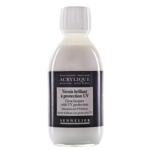 Sennelier Gloss lacquer UVLS.. Man kan applicera den med en pensel eller pensel på en helt torr yta. Innehåller anti-UV-medel, skapar den en skyddande film som dämpar färgernas ljusstyrka och är resistent mot de skadliga effekterna av ljus och mot repor. Använd den som den är eller utspädd i vatten. Den kan man blanda med glanslack för att få en skräddarsydd satinfinish. Interiör eller exteriör användning. Genomskinlig, ej gulnande, vattenbeständig och irreversibel när den är torr.