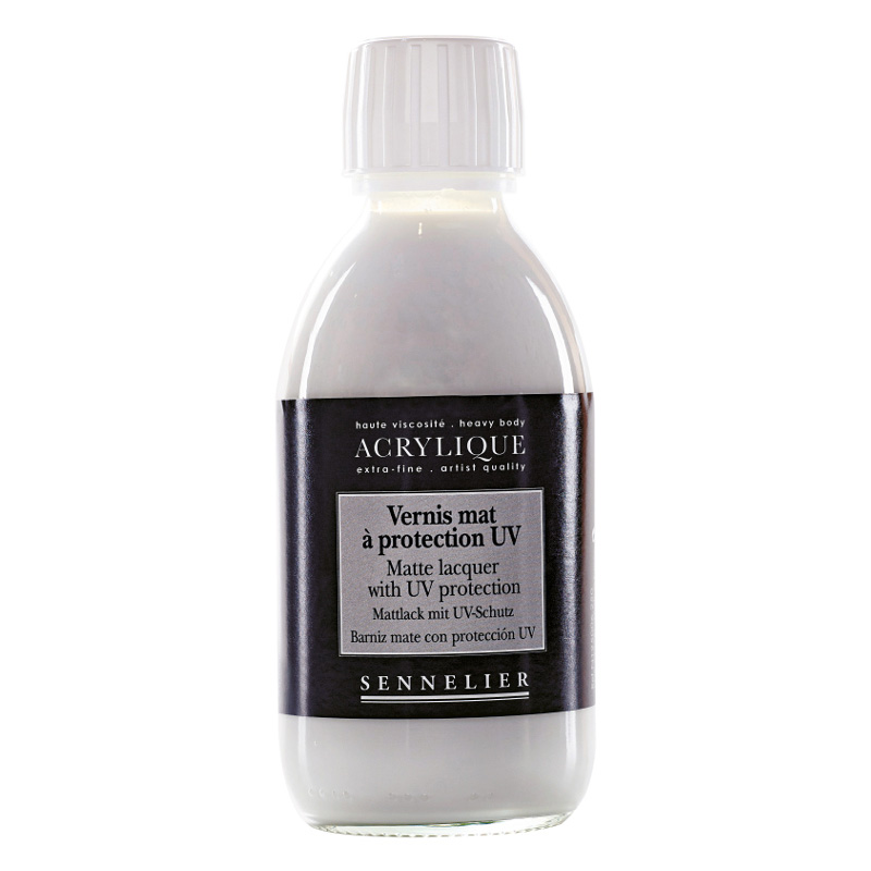 Sennelier Matte lacquer UVLS. Man kan applicera den med en pensel eller pensel på en helt torr yta. Innehåller anti-UV-medel, skapar den en skyddande film som dämpar färgernas ljusstyrka och är resistent mot de skadliga effekterna av ljus och mot repor. Använd den som den är eller utspädd i vatten. Den kan man blanda med glanslack för att få en skräddarsydd satinfinish. Interiör eller exteriör användning. Genomskinlig, ej gulnande, vattenbeständig och irreversibel när den är torr.